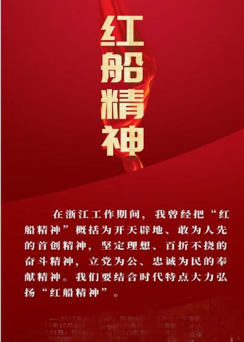 2005年6月21日,时任浙江省委书记的习近平同志在《光明日报》上发表了题为《弘扬红船精神,走在时代前列》的署名文章,第一次系统地将中国共产党的源头精神概括为“红船精神”,并以深邃的历史思考和凝练的理论表达,将“红船精神”集中概括为开天辟地、敢为人先的首创精神,坚定理想、百折不挠的奋斗精神,立党为公、忠诚为民的奉献精神。“红船精神”作为党的革命精神之源,构成了中国共产党革命精神和当代中国精神的核心内容,彰显出跨越时空的永恒价值和强大生命力,闪耀着熠熠生辉的璀璨光芒。