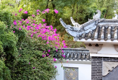 2024年11月5日,在四川省广安华蓥市文艺之家,鲜花映衬着古色古香的楼廓。