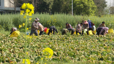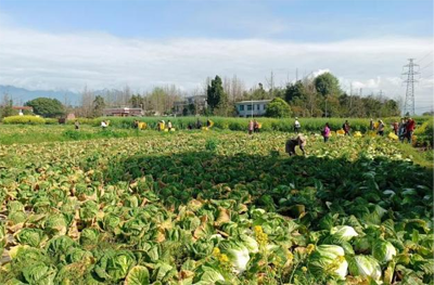 2024年3月25日上午,天空被一场夜雨洗刷得湛蓝如新,晴空暖阳下,省、市老科协农业科技示范基地、科技支农助农服务联系点,位于天马镇的四川圣寿源蔬菜基地内,几十位工人正忙着砍菜、运输、装车,一辆辆大货车装满即走,现场呈现一派繁忙的景象。基地负责人蒯世军笑着说:“今年种的这批寒美黄大白菜,产量高,价钱也好,总体收益不错。”