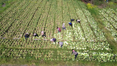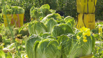 现场上,一大片蔬菜基地内,没有采摘的大白菜外部还有被雨雪霜打的痕迹,色泽灰扑扑的。可手起刀落,褪下外皮,只见它嫩绿清新、新鲜水灵。平均一颗都有六到七斤重。工人们抱起它装在背篼里、或是码放在车上,动作都小心舒缓,确保把损耗降到最小。