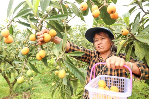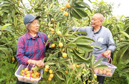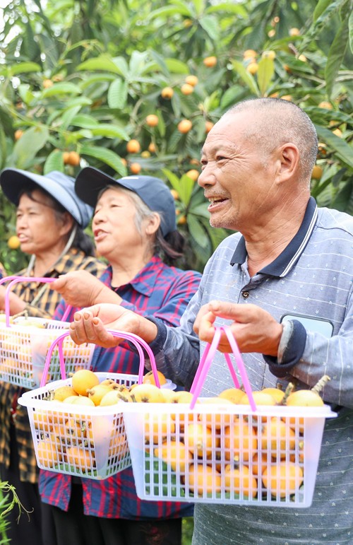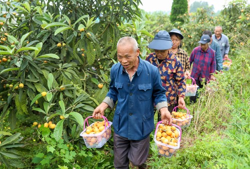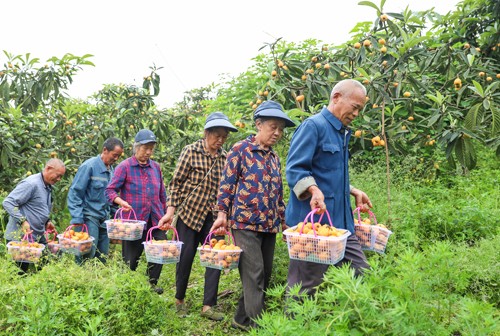 2024年4月20日,四川省华蓥市永兴镇陈家湾村的果农,在采摘从苏州引种的优质枇杷。