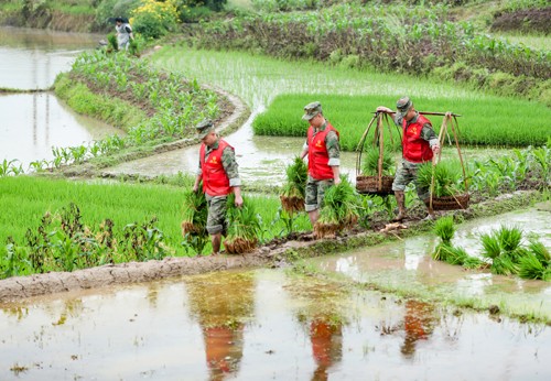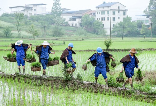 2024年4月22日,四川省广安华蓥市退役军人事务局组织的退役军人志愿服务助耕队,在华龙街道东方村冒雨帮助缺劳农户搬运移栽的秧苗。
