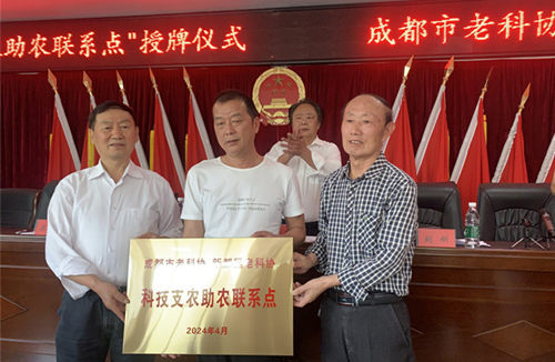 成都市老科协副会长兼秘书长王宗全和区老科协副会长王新友向新都区新繁街道檀木社区蔬菜合作社授牌。