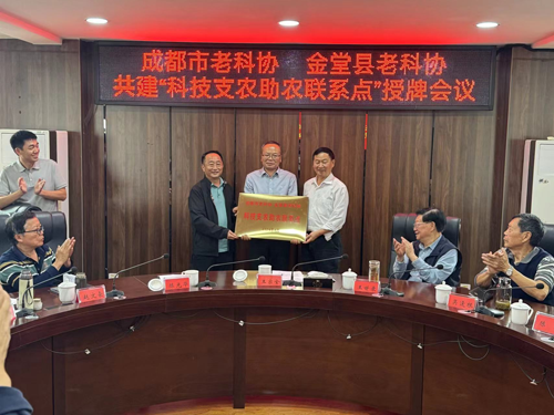成都市老科协常务副会长兼秘书长王宗全、金堂县老科协会长陈光华向官仓街道办授予了“科技支农助农联系点”的铜牌。