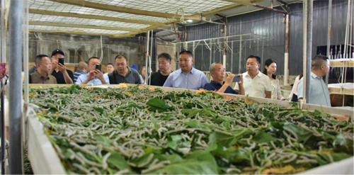 在泉水村现代蚕桑产业园,调研组一行深入桑园和蚕房,实地考察桑的种植、蚕的养殖现状,听取了宝源蚕业专业合作社负责人陈昌华的情况介绍。调研组一行对蚕桑的养殖模式、蚕茧质量以及产业链延伸等情况进行了详细询问和探讨。