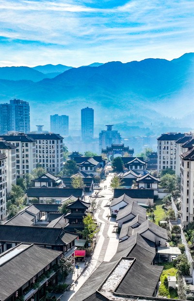 鸟瞰四川省华蓥市“天上街市”古色古香的文艺之家。