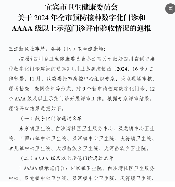 为加快推进健康四川建设,规范预防接种工作,加强预防接种单位管理,提高预防接种服务质量,保证预防接种安全。兴文县组织县域内医疗机构积极开展预防接种数字化门诊和AAAA级以上示范门诊评审。近日,宜宾市卫生健康委员会公布了2024预防接种数字化门诊评审情况,大坝苗族乡卫生院、大河苗族乡卫生院被评为5A级预防接种示范门诊。另外,古宋镇卫生院、僰王山镇中心卫生院也于去年被评为5A级预防接种示范门诊。