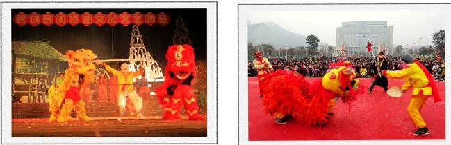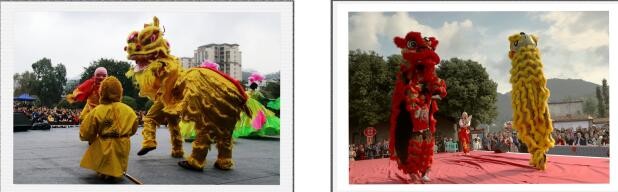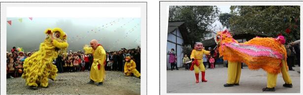 左图→2015年2月20(农历正月初二)日,珙县罗渡苗族乡王武寨举办一年一度苗族特色的“花山节”,其中有耍狮子的场面;右图→2015年2月6(农历腊月18)日,巡场民俗传播队到巡场镇茨黎山庄给老板拜年,其中有耍狮子的场面。