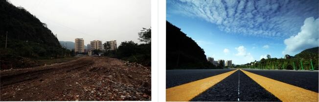 S436巡玉路武家岩变电站对面那段公路,依次摄于2021年4月20日和2022年6月27日改造建设完成的场面。