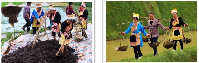 插秧有时用牛粪为主的农家肥做底料,靠村民挑到田边供插秧人用。
