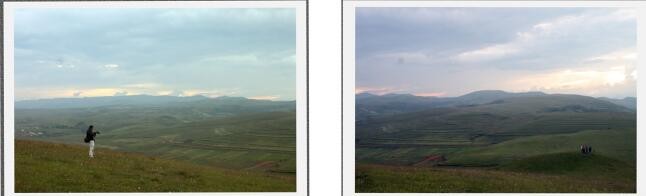19︰00,秘书长叫我去拍晚霞,汽车行驶了10分钟,在“大海子”的地方停了下来,大家徒步爬了约100米的高坡到了海拔较高处,高原坡顶上的风特别大,气温大概在13℃左右寒风凛凛,从巡场出发的气温是29℃,骤然出现16℃的温差,身体是什么感觉还用说吗?