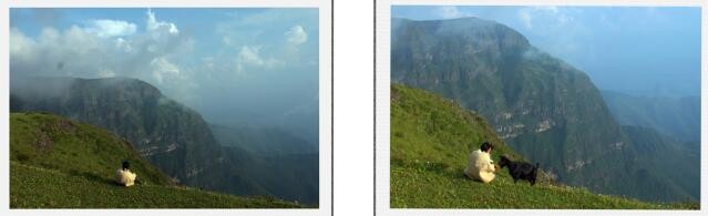 如果当时有用“M”档,设置“22”的光圈、“1/10”秒的曝光速度和相应的“感光度”,相机架在三脚架上拍摄,将山形拍成剪影,悬岩下的场景就会完全清楚。