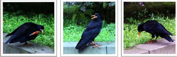 红嘴乌鸦在草坪边自由遛达