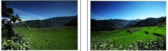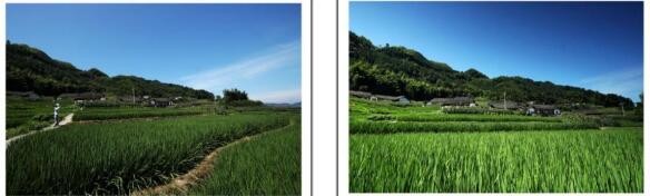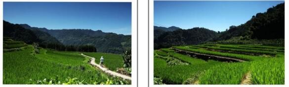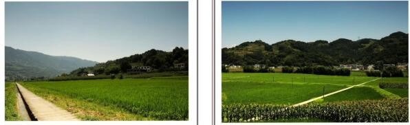 随水稻望去远处是成片的几十户木串架的瓦房