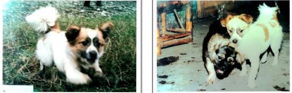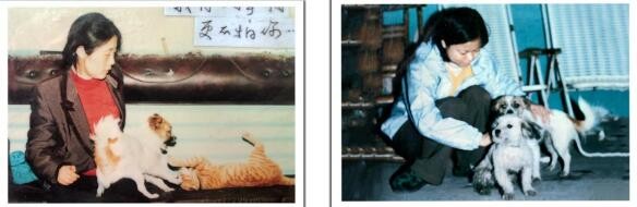 图(1)娇子(狗)有我夫人给它撑腰勇敢地与泼妇(猫)打斗;图(2)我侄女拉着娇子和它的崽崽。