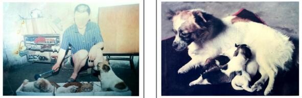 图(1)我每天早晨外出锻炼回来,要给泼妇(猫)、娇子和它的崽崽们上早读课,用软胶球依次轻轻敲打它们的背,过去只有泼妇、娇子时,娇子是乖乖地趴着等着敲打,现在有它的崽崽们参与时,娇子就坐着,好像是叫不要敲打它的崽崽啊;图(2)娇子是条草狗(母狗),一次就下了四只崽崽。民间管狗为草狗(母狗)和牙狗(公狗)。