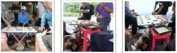 在巡场镇滨河西街南一段34号早餐店门口,随时有两桌相棋在那里比赛,观战的人比下棋的人多。有一天出现了“上战下和”的场面,上面相棋杀得腥风血雨,下面两只狗儿友好地睡它们的觉。