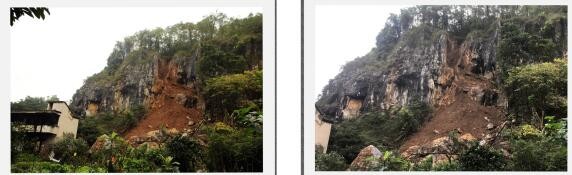 左图→巡场镇兴太村(白皎煤矿背后)垮山场面;右图→巡场镇德田村通往田坝的环山公路路边撕裂的场面。(图片是珙县发改局的人员陪同拍摄)
