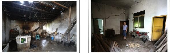 左图→巡场镇新达街...号房屋受损场面;右图→巡场镇中心路51号教育局小区隔墙垮塌场面。