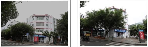 巡场镇“国新联程汽修厂”背后的山头在地震时出现了裂缝,整个山头可能会向右下滑,直接威胁到下面芙蓉苑B区居民小区几百户市民的财产和人生安全,灾后政府用“蚂蚁搬家”的方案将整个山头搬走了——“愚公移山”现代版,图为地震前后对比场面。