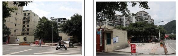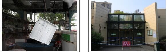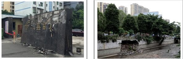 左图→巡场镇迎宾广场书亭受损场面;右图→僰文化广场公共厕所受损场面。
