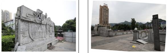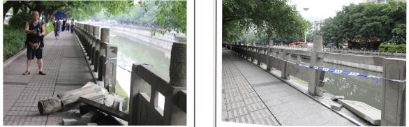 左图→巡场镇滨河西路北三段巡场河边石栏板受损场面;右图→巡场镇滨河西路北一段(珙县住建局门口)巡场河边石栏板受损场面。