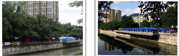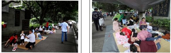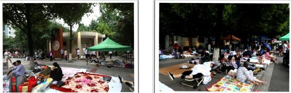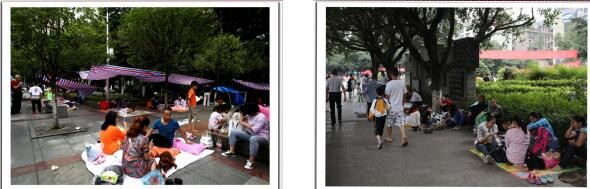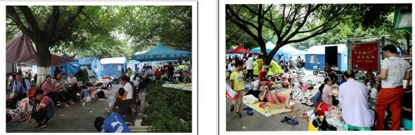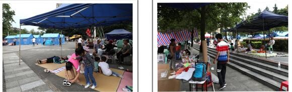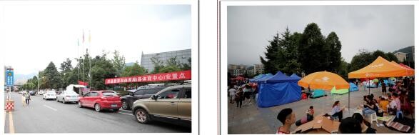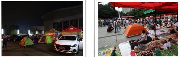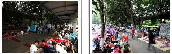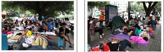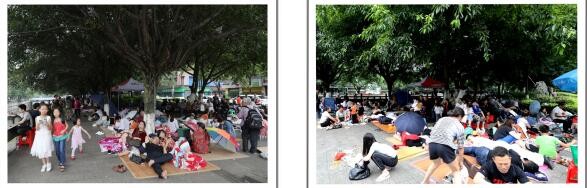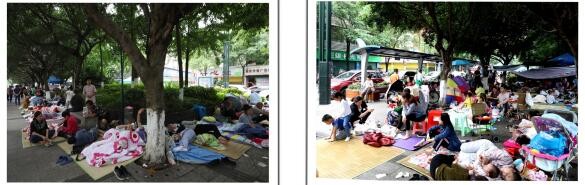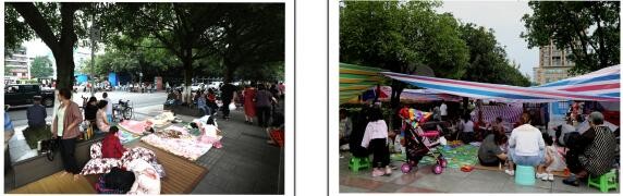 左图→巡场文化公园门口路边的避难场面;右图→巡场迎宾广场内的避难场面。