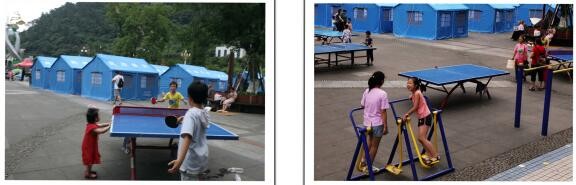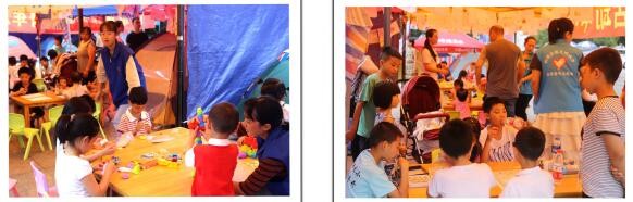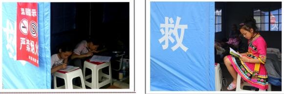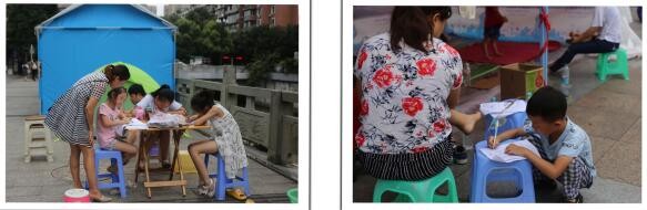 在安民桥头帐篷边做作业的小女孩们 在僰文化广场做作业的小男孩