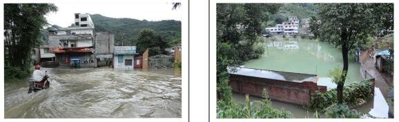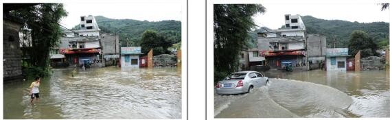 2009年8月30日,巡场镇巡检街矿山医院门口路段被水淹的场面