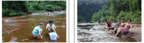 大人们有的在河中走来走地戏水,有的坐在河边脚踏着水,手摇着蒲扇或簚扇谈天侃地。