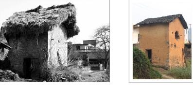 我们生产队经济条件差,生产队的炕房(左图)就是这样的风格,干打垒墙石头之间有缝穴,表面没有像(右图)用三合土湖面。