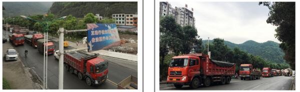 过往巡场镇城区的重型货车川流不息