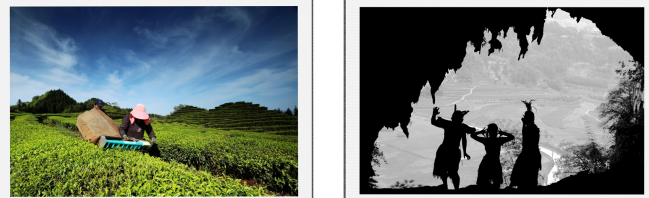 图片的拍摄手法当然有讲究,要保证人物劳动情景自然清晰,相机曝光速度设置为1/300秒。既要表现人又要表现茶海,使画面远近都能看得清楚,相机光圈设置为22。要突出人物用滤镜压了天空的光线。