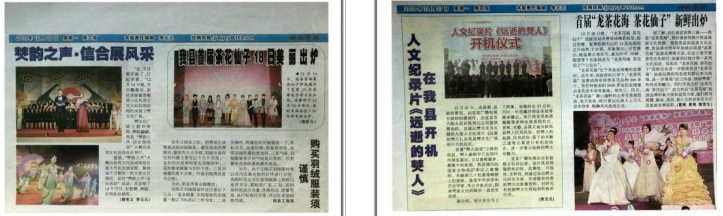 图(1)→珙县县委宣传部主办的《神韵僰都》(2010年12月20日)报道了12月10日举行的“龙茶花海 茶花仙子”选拔复赛活动;图(2)→《神韵僰都》(2010年12月27日)报道了12月20日举行的“龙茶花海 茶花仙子”选拔的决赛活动。