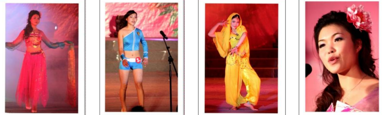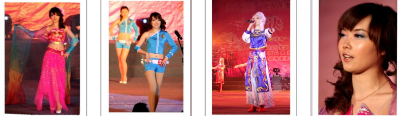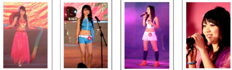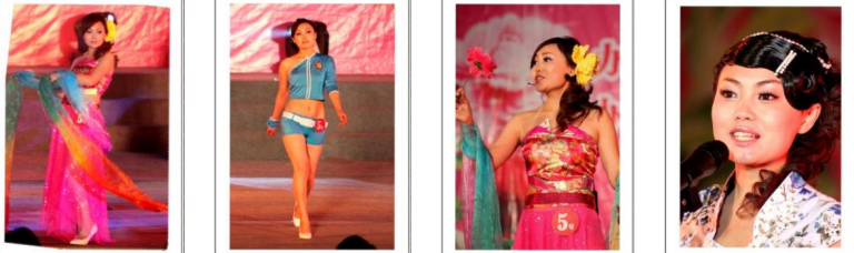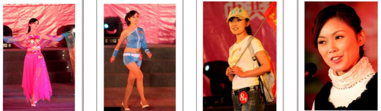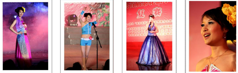 图(1)→主持人罗君(左)、谭丽莎(右); 图(2)→茶花仙子叶平(最佳聪慧) ;图(3)→茶花仙子程雪(最佳形象) ;图(4)→茶花仙子何蝉(最佳才艺) 。