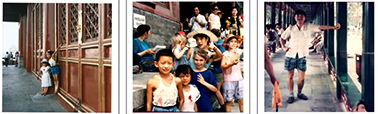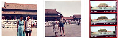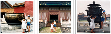 图(1):儿子和侄女在故宫内的留影;图(2):我夫人(戴白色布帽)手抱外国小朋友、儿子、侄女和外国小女孩在故宫内的留影;图(3):我在故宫内的留影。