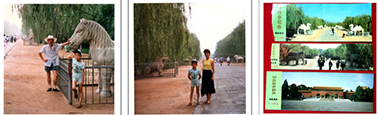 图(1):我和儿子在参观十三陵的“神路”的留影;图(2):夫人和儿子在参观十三陵的“神路”的留影;图(3):参观十三陵的门票3元/人、1元/人和0.6元/人。