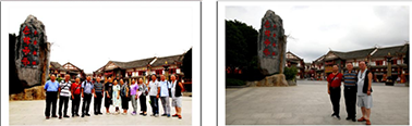 图(1)我们在奢香古镇标志前合影留念,左起:蒋国彬、刘忠华、孙东升、李刚、高朗、熊宗连、陈小红、韦国、陈正琼、黄泽莉、陈耀祖、霍金生、何家宾、饶世义;图(2)孙东升、高朗、饶世义在奢香古镇标志前合影留念。