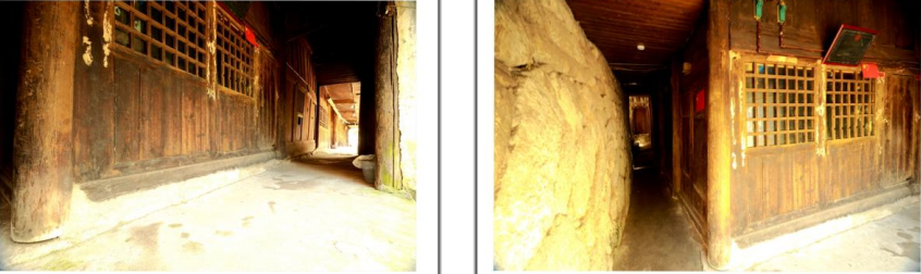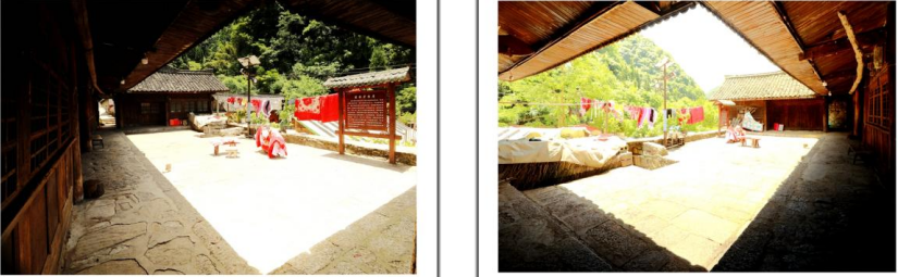 苗族老祖屋正房南北向,落地式结构,一楼一底,居中一进的前间为堂屋,较东西两进略有退缩 ,退缩部分形成比较宽敞的堂檐。整个堂檐和滴水之内的屋檐下,以石板通铺,特别是堂檐石板,长丈二,宽八尺,重吨余。