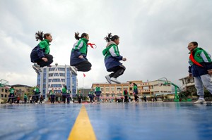 图为2022年12月30日,四川省华蓥市双河小学的学生在课间跳绳, 驱散冬日的寒意。 (邱海鹰 刘南贤)