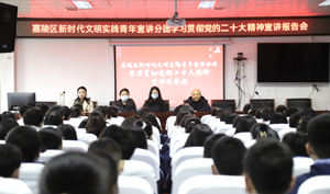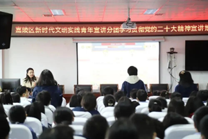 青春心向党,奋进新征程。12月1日上午9时许,嘉陵区新时代文明实践青年宣讲分团学习贯彻党的二十大精神宣讲报告会在南充市李渡中学一教学楼五楼会议室隆重举行。本次宣讲活动由南充市中学政治任仔东名师工作室宣讲分团承担,嘉陵区宣传部、共青团嘉陵区委领导到会指导。宣讲活动旨在推动党的二十大精神进校园、进班级,入脑入心,其主题为“青春献礼二十大 强国有我新征程”。南充市中学政治名师工作室主持人、南充市李渡中学副校长任仔东主持会议,高一年级180余名师生代表全程参加。