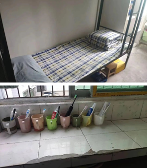 首先是寝室内务整理:被子折叠整齐划一;储物柜要求每人一格,衣物折叠整齐,物品摆放有序;鞋子摆放鞋跟朝外,成一条直线,统一放在床下靠窗一侧;口杯、牙刷在寝室窗台靠墙一侧,从左到右依次摆放……