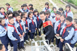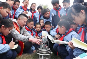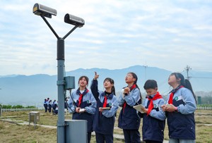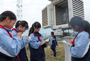 2023年3月21日,四川省华蓥市红岩小学的学生在气象站参观气象自动观测仪,并记录各种仪器的作用。(邱海鹰 孟 喆 摄影报道)
