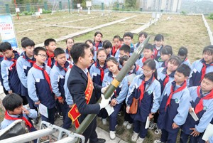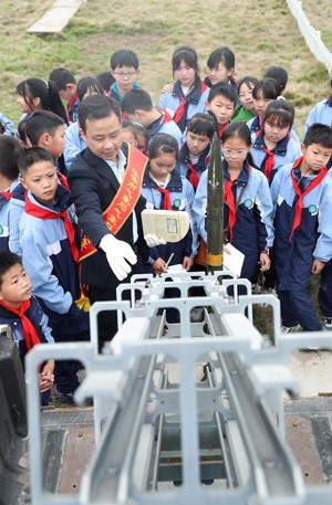 2023年3月21日,四川省华蓥市气象局的工作人员在气象站,给来自红岩小学的学生讲解人工增雨防雹火箭的作用及其使用知识。