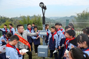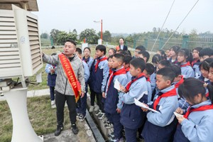 2023年3月21日,四川省华蓥市气象局的工作人员在气象站,给来自红岩小学的学生讲解气象自动观测仪的原理及其作用。