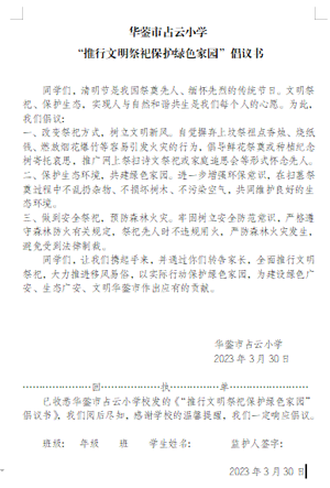 以放发“推进文明祭祀保护绿色家园”倡议书的形式教育全校师生及家长保护我们的生态环境,推广网上祭扫、诗文祭祀等文明祭祀行为。(梅世勇 罗 伟)