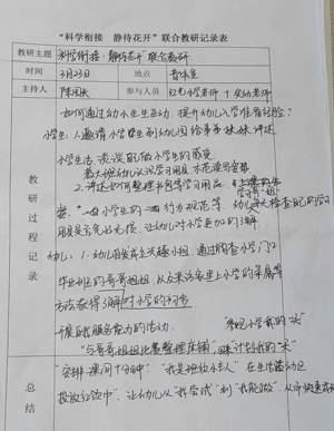 通过此次联合教研,搭建校、园老师之间相互了解、交流研讨的平台,不仅为幼儿园与小学之间提供了知识共享、经验共享和情感传递的机会,也为幼小衔接工作提供了新的方向和思路。接下来,幼儿园将继续与小学携手共研教育教学方法,按阶段分层次把幼小衔接内容整合进幼儿园日常教育目标中,循序渐进做好衔接工作,力争为幼儿健康发展贡献自己的力量。