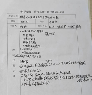 科学有效的幼小衔接是幼儿园与小学的联建联通,更需要学生家庭的通力协作。针对如何发挥幼儿园和小学在科学幼小衔接中的作用,校、园双方本着遵循儿童身心发展规律和教育规律的原则,初步拟定了校、园幼小衔接联合教研方案, 共建幼小衔接资源库、构建幼小衔接共同体,在入学准备教育、幼小联合教研、家、园、校三方座谈、专题家长讲座、入学适应教育等工作中稳步推进幼小科学衔接工作的开展。
