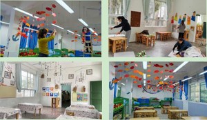 在帮扶前期,古宋二幼的老师们首先实地参观了两个幼儿园的园所环境,户外场地、幼儿活动室及功能室等,对环境进行了细致的探讨。在参观后,老师们统一意见,成立帮扶工作小组,首先对两个幼儿园的环境创设进行帮扶。针对环境中存在的内容空、材料少等问题,提出了适宜两所幼儿园的环创方案。经过老师们的共同努力,教室的环境有了崭新的变化,两所园的环境创设有了很大的提升。
