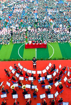 2023年5月31日, 四川省华蓥市双河小学的师生在“学习二十大,争做好队员”校园艺术节闭幕汇演暨六一表彰活动上表演大合唱“没有共产党就没有新中国”。